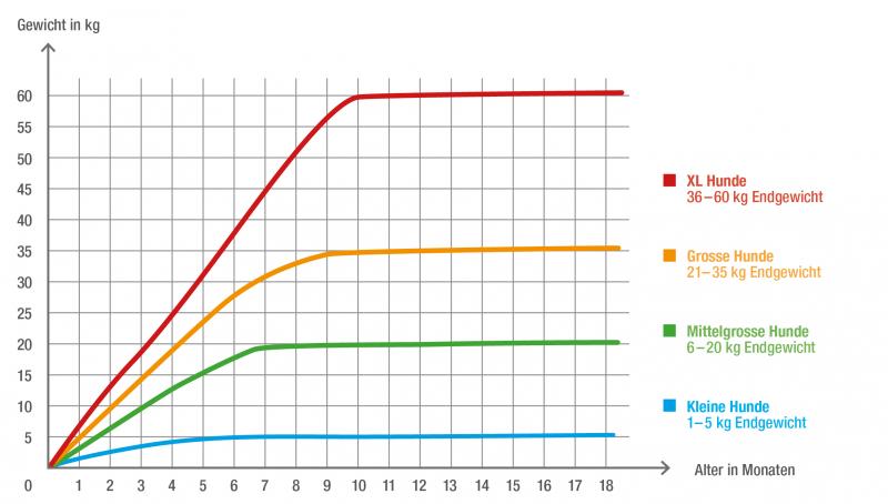 Füttern Sie erst dann ein Hundefutter für erwachsene Vierbeiner, wenn der Hund ausgewachsen ist. Kleine Rassen sind mit ca. 10 Monaten und mittlere Rassen mit 12 Monaten ausgewachsen. Grosse Rassen und Riesenrassen erst mit 18 bis 24 Monaten, je nach Rasse und Körperbau. Im ersten halben Jahr findet die grösste Gewichts- und Grössenzunahme statt. Für detailliertere Informationen können Sie sich beim Züchter oder Rasseverband über die Wachstumsphasen des Junghundes erkundigen.